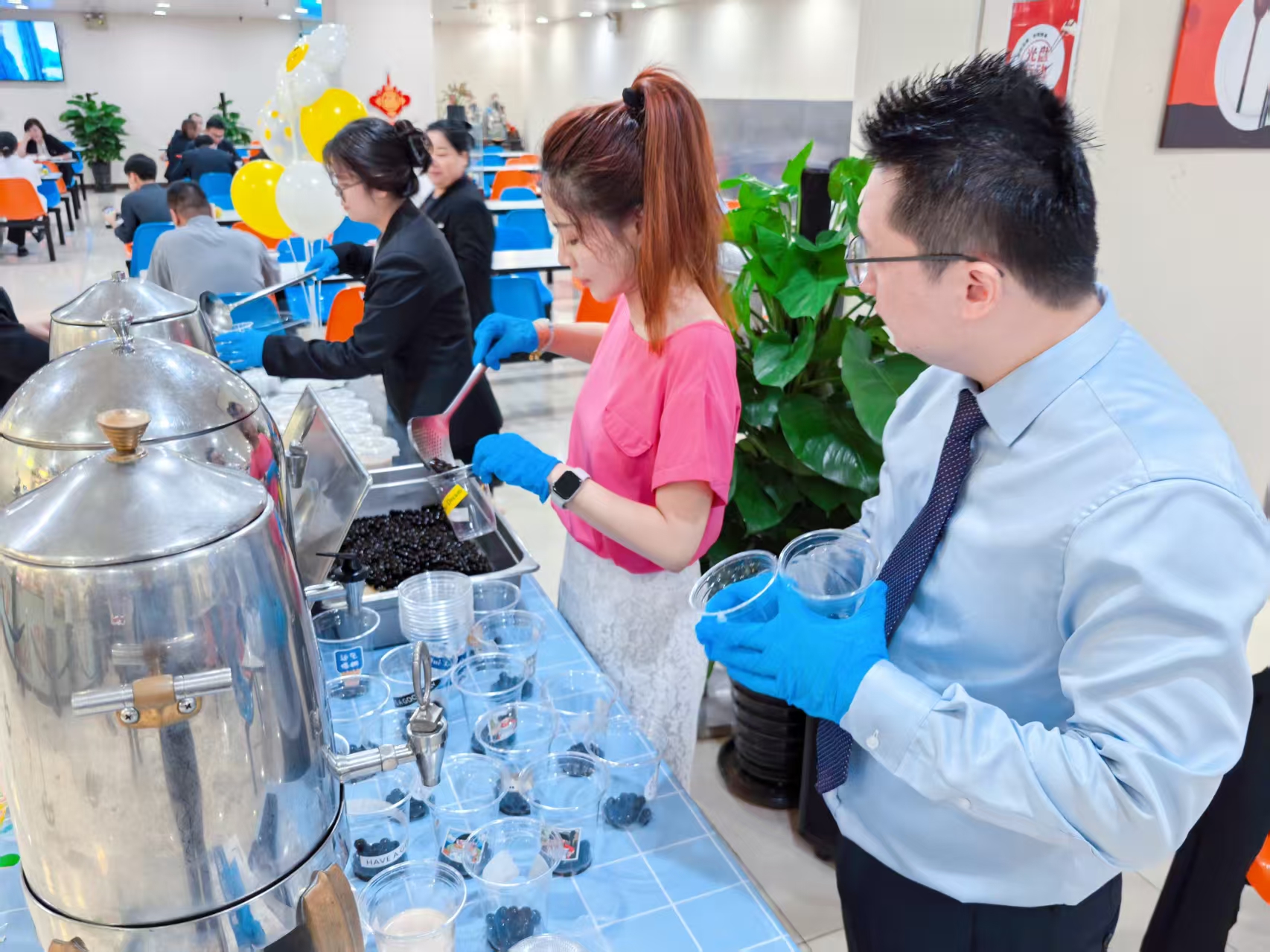 8 月 7 日 立秋当天,“秋天第一杯奶茶”在员餐厨师长及其团队的调制中降临,人事部与管理层将调制好的奶茶封盖装杯,递送到每一位员工手中。